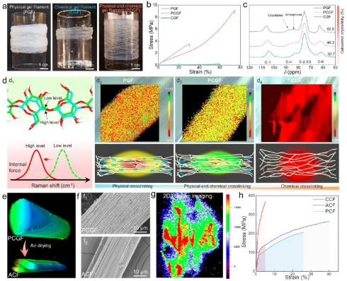 龙柱教授团队联合安徽农业大学叶冬冬团队,创造性地开发了美学纤维素纤维(ACF)的制备方法,破解了上述难题。所制备的ACFs在交叉偏振光下呈现斑斓的彩虹色,还表现出极强的韧性,即使单根纤维也可承受100克的重量,并且经过反复缠绕和解缠,纤维表面的有序纳米结构并未被破坏。更有趣的是,作者通过拉曼成像证实,简单的水触发即可调控ACF的内应力,从而实现纤维三维形态的自主定制:湿态下,纤维内应力极低,可以实现纤维的临时造型;而随着纤维逐渐干燥,纤维内应力开始变大,从而实现纤维复杂3D造型的记忆。