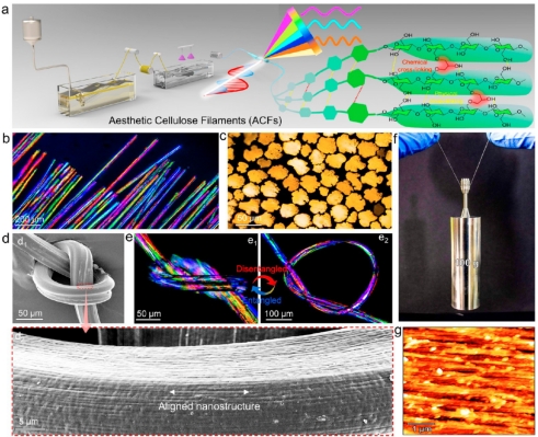这种性能优异的美学纤维在生活用品、时尚场景、光学织物防伪以及信息存储等领域具有广阔的应用潜力。同时,这种制备方法还可实现规模化、连续化生产,因此在产业化生产及应用中表现出极大的潜力。该研究以题为“Aesthetic Cellulose Filaments with Water-Triggered Switchable Internal Stress and Customizable Polarized Iridescence Towards Green Fashion Innovation”的论文发表在国际顶刊《ACS Nano》上,博士生傅晓童作为第一作者,龙柱教授作为通讯作者。