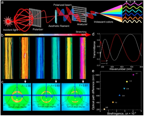 随着生活水平的提高,人们对美的不断追求促进了可穿戴纤维制品的蓬勃发展,其中以假发的市场需求最为广阔。传统假发制备的主要原料常为人发、动物纤维或化学纤维等。但这几种典型纤维或存在产量小、环境依赖性强等问题,或存在不可持续、不环保等问题。另外,目前对假发最主要的的色彩管理手段仍然依赖对健康有害的化学药剂染色,并且假发复杂多样造型设计的实现仍然需要借助复杂、耗时且损害健康的吹、拉、染、烫等传统手段。因此综合解决原料、显色方式、造型方式等多方面的问题,开发结合优异机械性能、美学和可持续性的可再生纤维仍然为可穿戴纤维领域的研究难点。