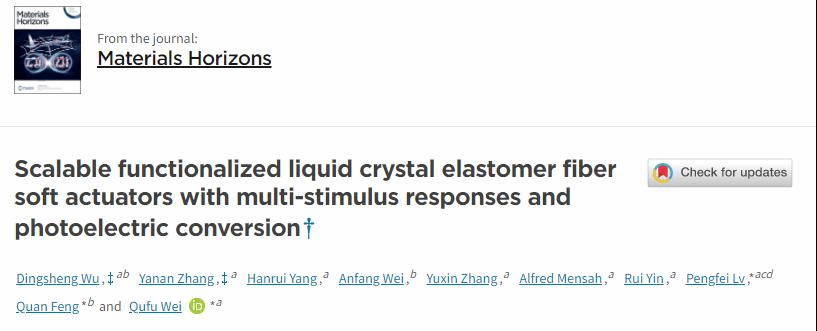 鉴于此,江南大学魏取福教授、吕鹏飞研究员和安徽工程大学凤权教授团队合作提出了通过一种简单的干法纺丝和涂层策略,规模化生产具有光、电、热多刺激响应和快速大致动变形的纤维软体驱动器。该纤维软体驱动器不仅结合了LCE的可逆形状变形特性和PDA@MXene的优异的长效光电特性,而且还实现了光、电、热多刺激响应快速驱动。为了验证纤维软体驱动器的光电领域应用前景,研究人员开发了光驱动的人工肌肉、微型光热智能电路开关和光驱动自适应智能窗系统。这项工作提出的策略为先进的多功能软体驱动器开辟了一个新的技术领域。相关工作以题为“Scalable Functionalized Liquid Crystal Elastomer Fiber Soft Actuators with Multi-Stimulus Responses and Photoelectric Conversion”的论文发表在国际权威期刊《Materials Horizons》上。该研究工作得到了国家自然科学基金、江苏省自然科学基金和江南大学高层次人才引进项目等项目支持。