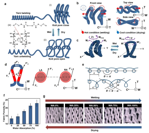 最近,江南大学纺织研究所孙丰鑫研究团队联合香港城市大学胡金莲研究团队,通过纱线捻曲形态和线圈手性螺旋的纺织多级结构调控,设计了具有湿响应孔隙调节的“超百叶”织物,实现了具有全天候热湿调控的智能纺织品开发。该织物可根据环境湿度自发地切换热湿流通的开关模式:当该超织物接触出汗的皮肤,纱线驱动器吸湿后主动退捻,诱导螺旋线圈实现同手性翻转,从而打开织物孔隙,提高织物的水汽传导和热量散失;在凉爽天气皮肤干燥时,纱线人工肌肉恢复原状,使螺旋线圈反向转动,关闭织物孔隙以实现保暖功能。此外,这种基于结构设计实现自响应功能的策略对其他传统纺织材料具有一定的通用性,有望为基于多级结构和尺度关联机制的超材料设计提供新的思路。