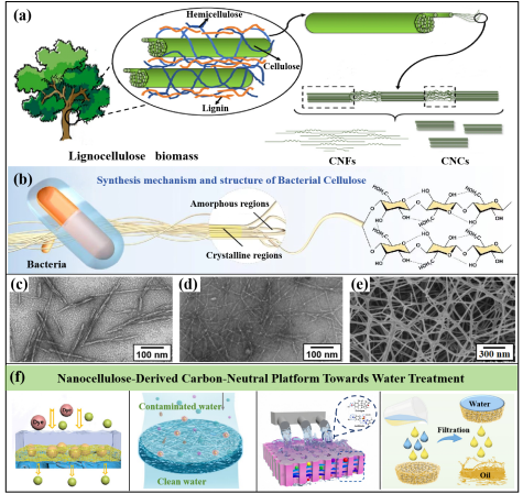 纳米纤维素主要分为三大类:纤维素纳米纤维(CNFs)、纤维素纳米晶(CNC)和细菌纤维素(BC),它们是由d -吡喃葡萄糖基通过β- 1,4连接的线性大分子,其形态、大小等特征因原料、提取方法和加工条件的不同而不同。CNFs的直径一般为20-50nm,长度为500-2000 nm,从植物纤维素分离得到。CNC是通过酸、酶或氧化剂对天然纤维素(如藻类、植物和木材)的无定形区域进行选择性水解或氧化降解而提取得到。BC是由醋酸杆菌等细菌通过生物技术合成的具有三维纳米纤维网络结构的纤维素材料。与以往报道的相关文献不同,本文系统地介绍了三类纳米纤维素从来源、提取、化学改性到功能性水处理材料制备的全过程,并提供了许多典型案例。重点介绍了纳米纤维素材料的独特性能、工作机理及其在水处理领域的应用前景,包括微/纳米颗粒过滤、染料/有机物吸附/降解、重金属离子吸附/检测、油水分离及海水淡化等。在此基础上,对连续规模化制造技术进行了深入探讨。最后,综述了纳米纤维素基功能材料在环境净化领域的潜在应用、机遇和未来挑战,我们相信在纳米技术、化学和材料科学等多学科交叉融合下,纳米纤维素基水处理材料的商业化应用将加速,同时也将向空气净化/过滤和二氧化碳分离等新兴领域发展。论文第一作者分别为ATM娱乐(中国)官方网站