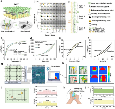 鉴于此,江南大学纺织研究所孙丰鑫研究团队基于“超构织物(meta-textile)”结构设计理念,开发出一种智能三重编织电子织物(TWET)。该织物不仅具备高灵敏度的多模态传感能力,还兼具红外辐射冷却与微液量的汗液快速传导等多重功能无缝集成,显著提升了穿戴过程中的热湿舒适性。这一“结构诱导功能”的超构织物设计理念,为新一代智能可穿戴设备提供了高度集成、可规模化生产的解决思路,展示出广泛的应用前景和工程化潜力,有助于推进可穿戴技术在户外运动、健康监测等领域的实际应用。相关成果以“Knot-Patterned Treble-Weaving Smart Electronic Textiles With Advanced Thermal and Moisture Regulation for Seamless Motion Monitoring”为题发表于《Advanced Functional Materials》,江南大学纺织研究所研究生赵洁云为论文第一作者。