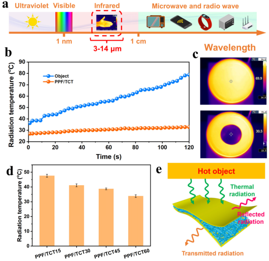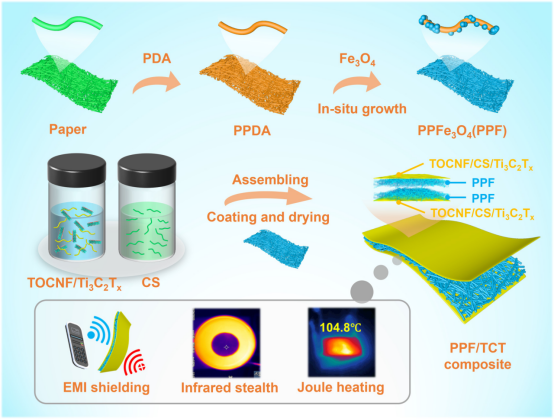 短纤维功能材料研究室戴磊教授课题组基于多孔纤维素纸、TEMPO氧化纤维素纳米纤维(TOCNF)、阳离子淀粉(CS)、Ti3C2Tx和Fe3O4提出了一种具有“导体-磁体-导体”夹层结构的纤维素基多功能复合材料。所得的纤维素基复合材料表现出优异的EMI屏蔽性能、红外隐身性能和焦耳加热性能。相关成果以Sandwich structured cellulose-based composite for electromagnetic interference shielding, infrared stealth and Joule heating为题发表在Carbohydrate Polymers(中科院一区TOP期刊,影响因子IF=12.5)期刊上,24级博士研究生韦嘉盛为论文第一作者,研究工作得到了国家自然科学基金(22178208;22478234)的资助。