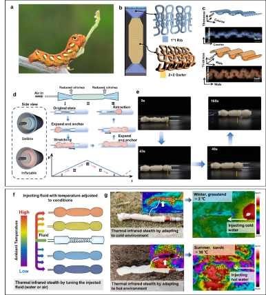 图3. 结构异构针织结构开发爬行运动与红外伪装功能的软体机器人。a 皮肤有褶皱的毛虫照片。b 仿生软体爬行机器人的针织编码设计图与结构模型。c 罗纹线圈横向(上)与双反面线圈纵向(下)的波纹截面图。d 软体机器人的设计原理与运动方式。e 单压力源驱动的软体机器人连续爬行过程快照。f 流体循环实现红外伪装的原理示意图。g 通过向机器人注入低温和常温流体实现红外伪装
