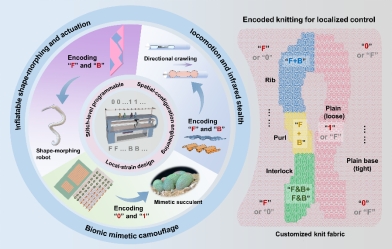 纺织结构材料交叉技术研究室孙丰鑫研究团队联合德累斯顿工业大学、劳伦森大学及上海国际时尚教育中心的研究人员,设计了一种新型柔性可编程纺织品超表面。这种材料可用于开发具备类似变形与伪装能力的机器人,相关研究成果以题为“Structurally Programmed Textile Metasurfaces for Soft Morphing Robotics and Bionic Mimetic Camouflage”发表于Advanced Fiber Materials。其核心是通过调整交织纱线线圈的几何排列,实现针织结构的精准工程化设计。研究人员提出一种基于结构驱动的设计框架:通过在编织外壳中引入空间局域的应变约束,仅凭针脚几何的调控,即可赋予软体机器人系统与仿生伪装所需的形态变化能力。结合改进的超弹性力学理论分析,将织物宏观力学行为解耦为针脚拓扑与纱线组成的独立作用,并通过几何调控实现了可编程的力学响应。