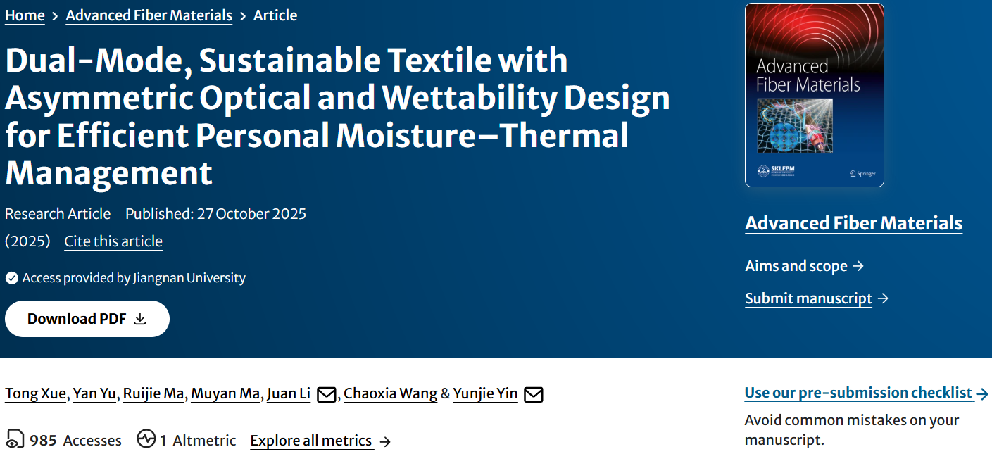智能纺织新材料研究室殷允杰教授在国际顶级期刊Advanced Fiber Materials上在线发表了题为“Dual-Mode, Sustainable Textile with Asymmetric Optical and Wettability Design for Efficient Personal Moisture-Thermal Management”的研究论文。该研究通过分层静电纺丝技术,制备了一种具有不对称光学性能、润湿性和孔径分布的双模式聚乳酸基个人热管理纺织品(DMTex),用于高效的个人湿热管理。独特的光学结构设计和功能颗粒的添加使DMTex具有优异的光学性能。三层结构设计赋予DMTex优异的单向导湿和防反渗性能。同时,DMTex还具有良好的耐磨性、生物相容性和可降解性。这种双模且可持续的DMTex在实现高效的个人湿-热舒适性方面展现出巨大潜力。ATM娱乐(中国)官方网站