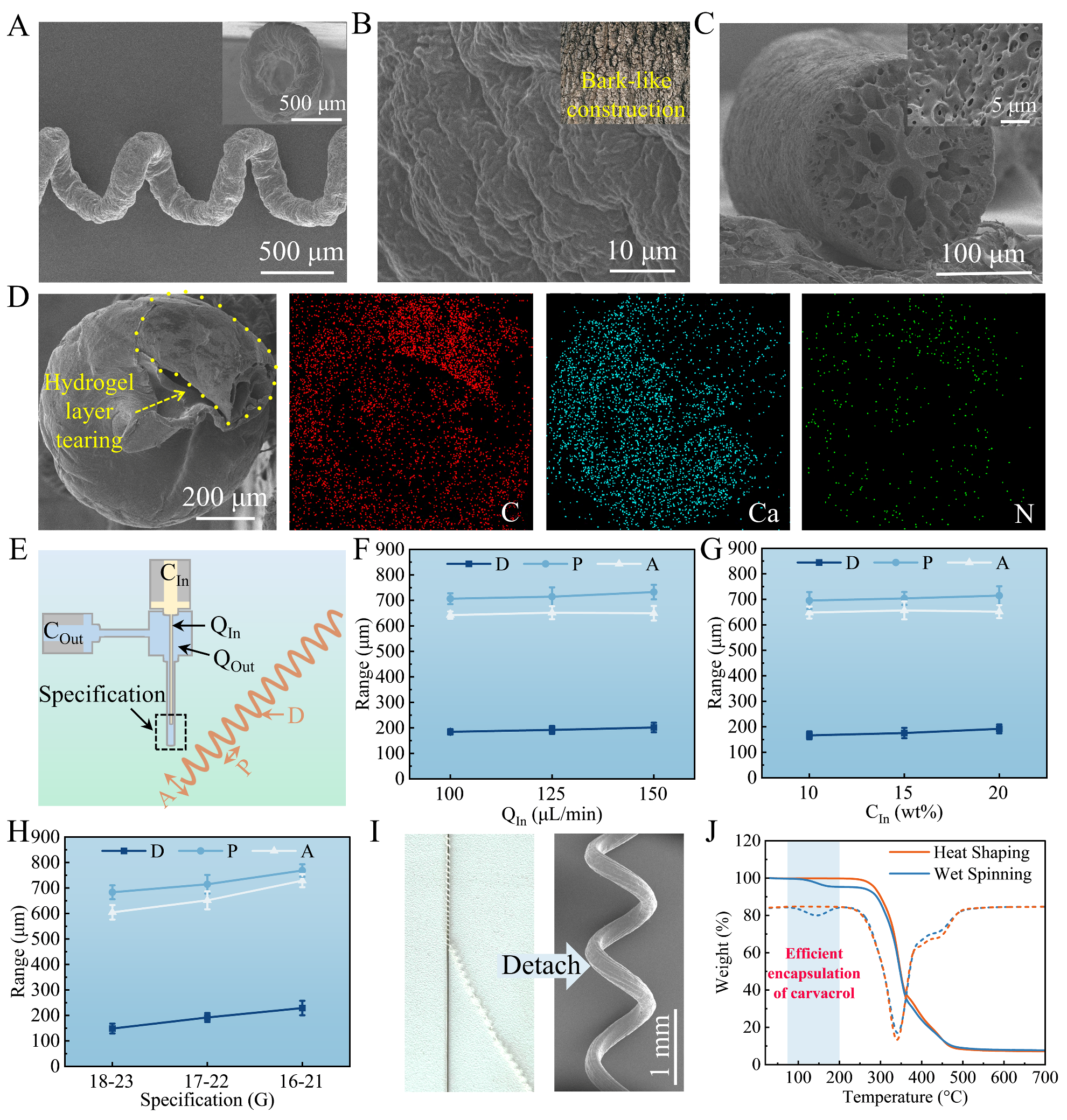 如图3所示,在较高内外相流量比下,外相海藻酸钠对半凝胶态内相聚氨酯产生反向剪切,应力积累诱导其发生失稳,进而盘旋折叠。与此同时,外相在凝固浴中迅速离子交联,形成刚性壳层,构成外壳限域效应,防止螺旋结构松弛或拉直。以上过程总结为:异质绳圈效应+壳层限域的协同机制。在这一过程中,非等长针头、凝固浴、内外相流体性质是关键性因素。此外,基于上述机制,该方法具备一定的拓展性(装置简易化:通过一次性针头组装成功纺丝;原料普适化:制备聚己内酯基螺旋纤维)。
