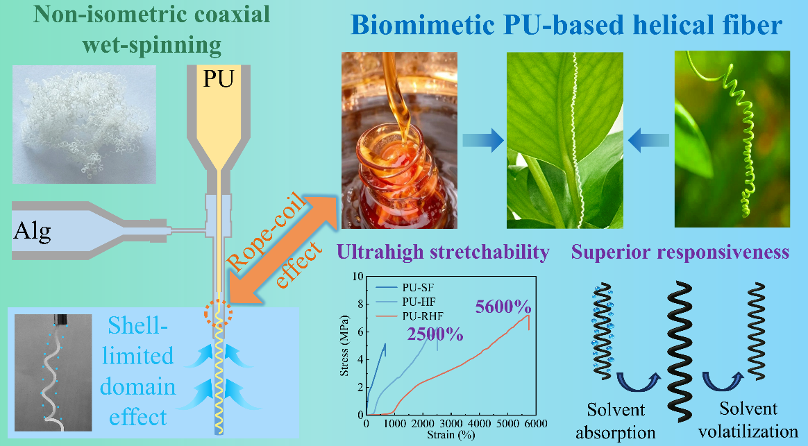 近日,江南大学魏取福教授、黄锋林教授、王清清副教授团队在期刊《Advanced Fiber Materials》上发表了最新研究成果“非等长同轴湿纺规模化制备用于智能纺织品的仿生螺旋纤维”(Scalable Fabrication of Biomimetic Helical Fibers by Non-Isometric Coaxial Wet Spinning for Smart Textiles)。该研究提出了一种可扩展的非等长同轴湿纺策略,整合了异质绳圈与外壳限域机制,制备了超高弹性、可回收性、连续生产的稳定螺旋纤维,通过结构设计和原料优化实现热调节和刺激响应功能拓展,为设计智能纺织品提供了简单、可靠的新方案。