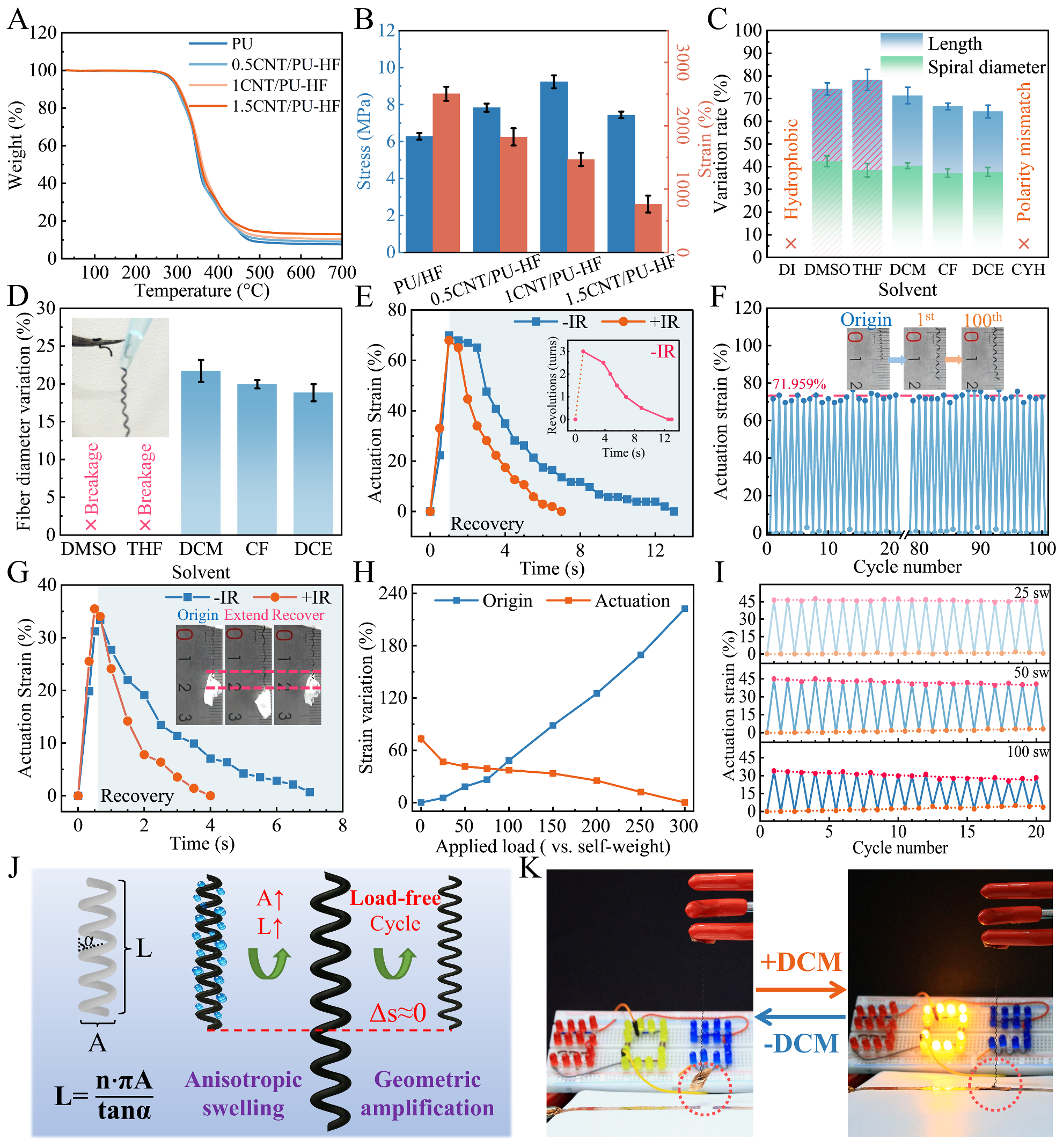 图5. CNT/PU基螺旋纤维的构筑及溶剂驱动特性