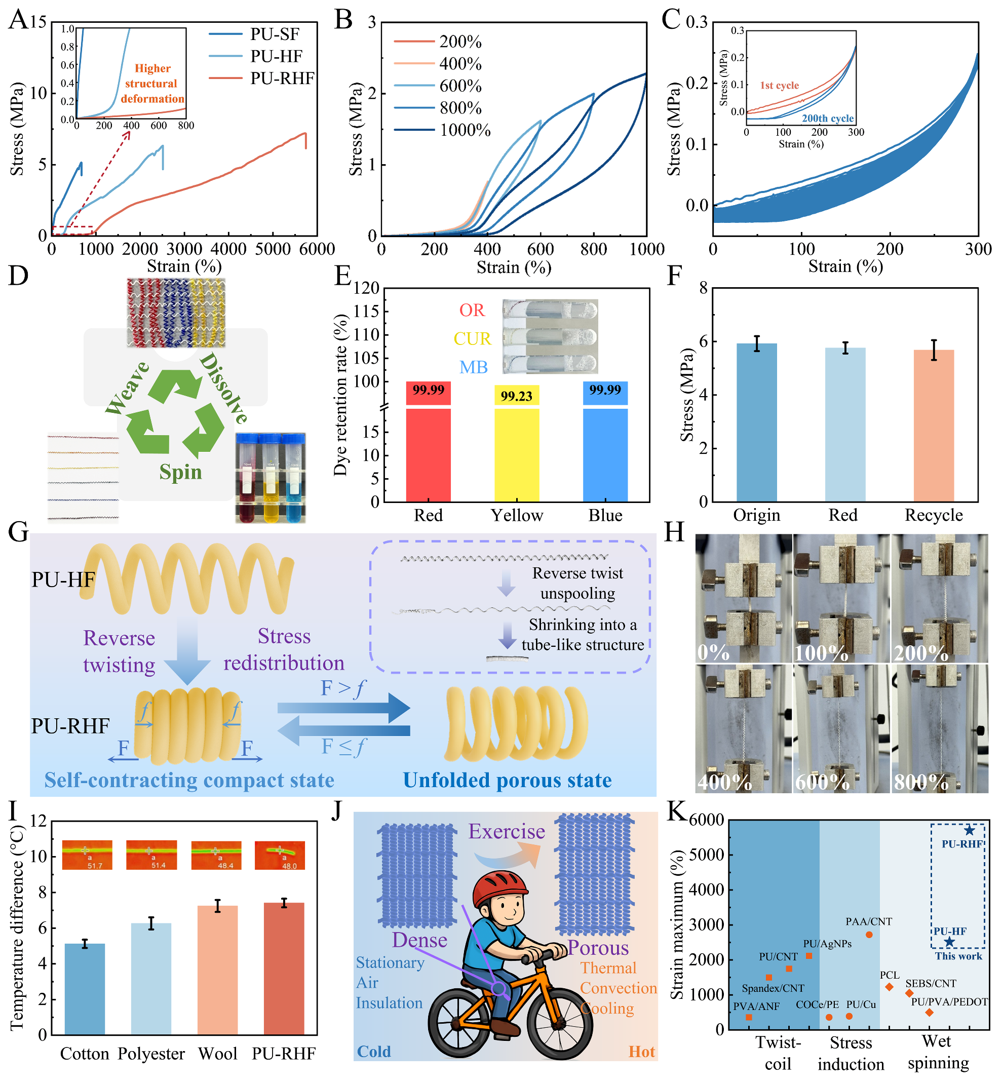 如图4所示,PU基螺旋纤维展现出:超高断裂伸长率、极低初始模量、优异的循环稳定性和压缩回复性。此外,该工艺支持纺丝—织造—回收的闭环体系,通过原液着色制备的多色螺旋纤维色深值高且耐水洗性强,回收复用性显著且强度损失极小。进一步,对上述PU基螺旋纤维进行反向加捻,为平衡捻幅差异产生的内外层应力,螺旋纤维会自发轴向收缩形成紧密接触的管状螺旋结构。自收缩管状纤维的伸长率可达初始的55倍,可在拉伸状态下打开孔隙实现透气、增强热对流散热;在静止状态下结构致密、通过静止空气有效隔热,实现应变驱动的自适应热调节。