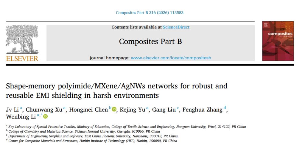 先进纤维与纺织复合材料研究团队在复合材料领域顶级期刊《Composites Part B: Engineering》(IF=14.2)上发表题为“Shape-memory polyimide/MXene/AgNWs networks for robust and reusable EMI shielding in harsh environments”的研究论文。该研究提出了一种基于形状记忆聚酰亚胺(PI)的梯度导电网络构建策略,通过将二维MXene和一维银纳米线(AgNWs)组装到静电纺PI纤维基底上,成功制备了具有“静态屏蔽”到“动态适应”转变能力的柔性电磁屏蔽复合薄膜。该研究为开发适用于复杂形变和严苛环境的新一代电子防护材料提供了创新思路。ATM娱乐(中国)官方网站