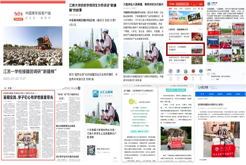 事迹获《中国青年报》《新华日报》中国青年网等媒体报道8次,援疆团作为代表团队参与了江南大学65周年校庆宣传片制作,并获得省级暑期社会实践优秀团队、学院学生年度人物等多项荣誉。