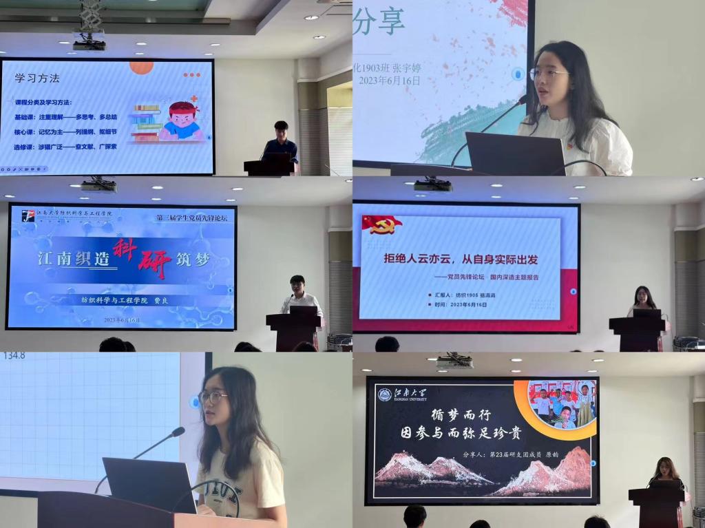 本次论坛遴选出各领域表现卓越的党员先锋孙熔声等六人,就专业学习、学科竞赛、科研探索、进修深造、基层就业、志愿服务作主题报告。轻化1903班张熔声分享了自己的学习方法与推免经验,针对不同类型的课程提出不同的学习方法与窍门;轻化1903班张宇婷分享了自己在学科竞赛上的心得,强调坦然接受挫折与失败,方能拥抱成功;纺博19级费良分享了自己的科研历程与成长感悟,以过来人的身份阐述了搞科研、做学术的基本方法;纺织1905班洛涓涓和20纺硕黄夏研分别分享了上岸东华和基层选调的经验,让与会人员对未来就业去向有了更加清晰全面的认识;22纺硕原韵则分享了前往边缘山区的支教经历,她志愿奉献、吃苦耐劳的精神激励着在场所有人。
