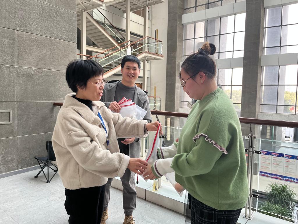 党委副书记陈艳君与毕业班辅导员吴丹来到图书馆、学生宿舍并通过班级学生干部慰问考研学生,送上学院精心准备的考试用品和橙子。预祝学生考研马到“橙”功!