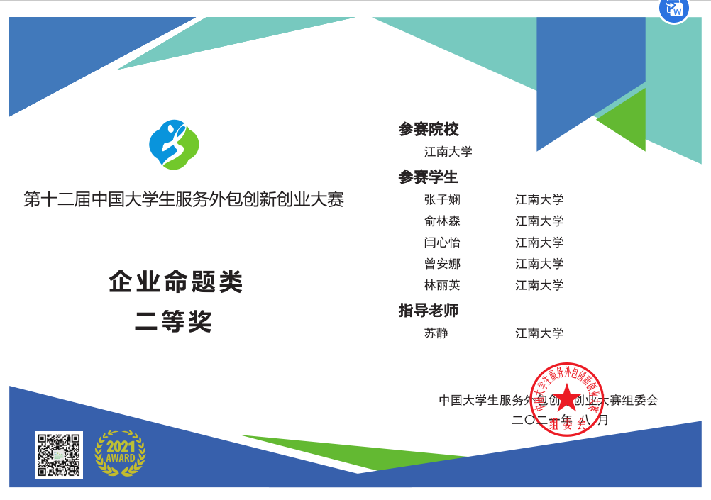 近日,第十二届中国大学生服务外包创新创业大赛在江苏省无锡市落幕。经过激烈角逐,由ATM娱乐 苏静老师指导,纺织1801班张子娴同学负责的科创作品《小微企业跨组织人才管理系统》(参赛学生:张子娴、俞林森、闫心怡、曾安娜、林丽英)荣获全国二等奖。