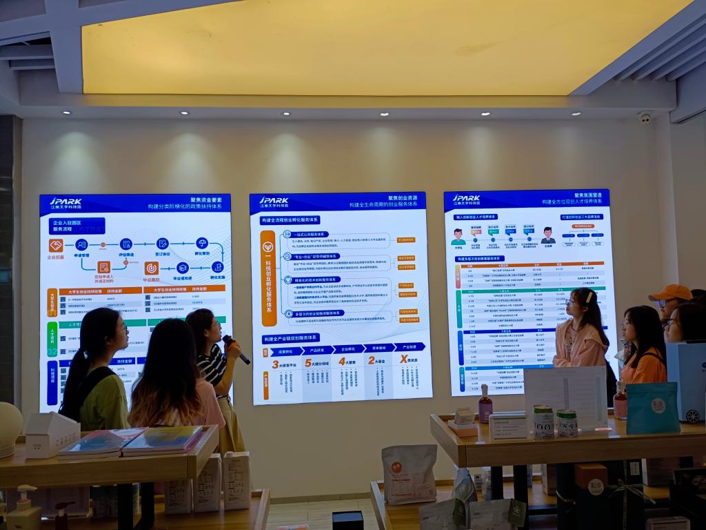 同学们首先来到大科园展厅,大科园总经理助理陈雪梅老师向大家介绍了大学科技园的基本状况,并对无锡市大学生创业政策进行深入解读。她表示,江南大学国家大学科技园是校地合作共建的大学生创业孵化示范园区,旨在依托江南大学学科优势,推动创新创业人才培养,服务于无锡市大学生、中高层次人才创业就业。大学生创业园始终秉承“以人为本”、“双创育人”工作理念,探索实践“生创师导”大学生双创特色孵化模式,培育以大学生为主体、以教授团队为支撑,以健康食品、智能制造、产品设计等江南大学优势学科为基础的双创生力军。她强调,大学生创业园迄今累计孵化212家实体,总体孵化成功率98.3 %,培育1家全国创新创业大赛优秀企业、1位江苏省大学生创业标兵、3位福布斯30U30精英等获奖项目。随后,同学们在大科园创业服务中心唐雨洁老师指引下,来到展示体验中心参观科技园的主要产品,化妆品、包装设计、健康食物……琳琅满目的产品激发了同学探索求知的兴趣。