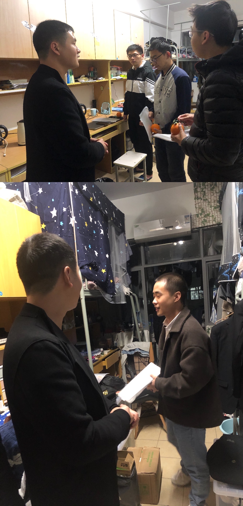 党委副书记陈艳君,毕业班辅导员吴丹来到学生宿舍等地慰问考研学生,送上学院精心准备的笔袋和橙子。