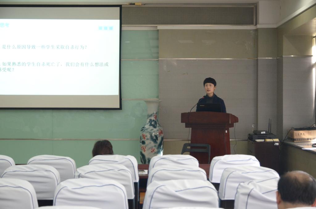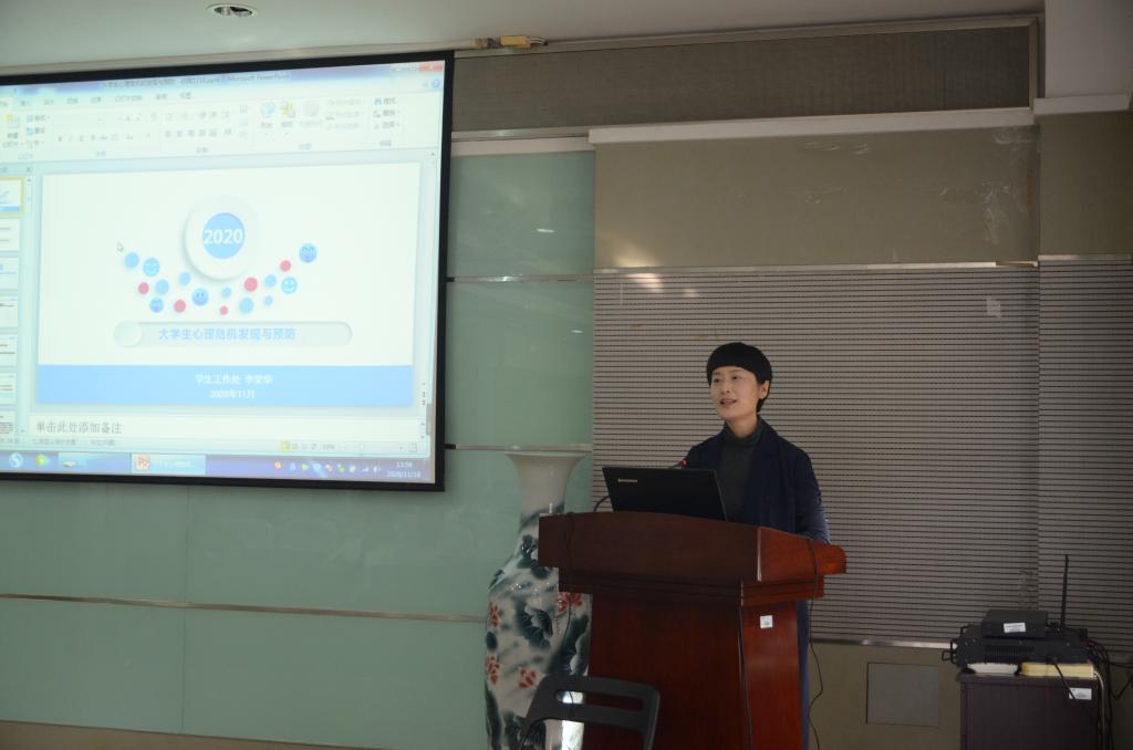 在纺院A103报告厅举办心理危机干预技能培训会。本次培训由学生工作部副部长兼研究生工作部部长李荣华老师主讲,全体院领导及教职工参加了本次培训。会议由院党委副书记陈艳君主持。