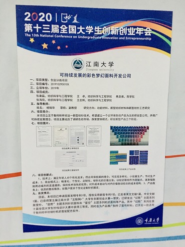 1030—111日,以“智汇青春 开创未来为主题的第十三届全国大学生创新创业年会在重庆大学举行。ATM娱乐 杨瑞华副教授指导2018级本科生张康磊等负责的国家级创业训练项目《可持续发展的彩色梦幻面料开发公司》从众多项目中脱颖而出,入选本届年会,进行线上展示。