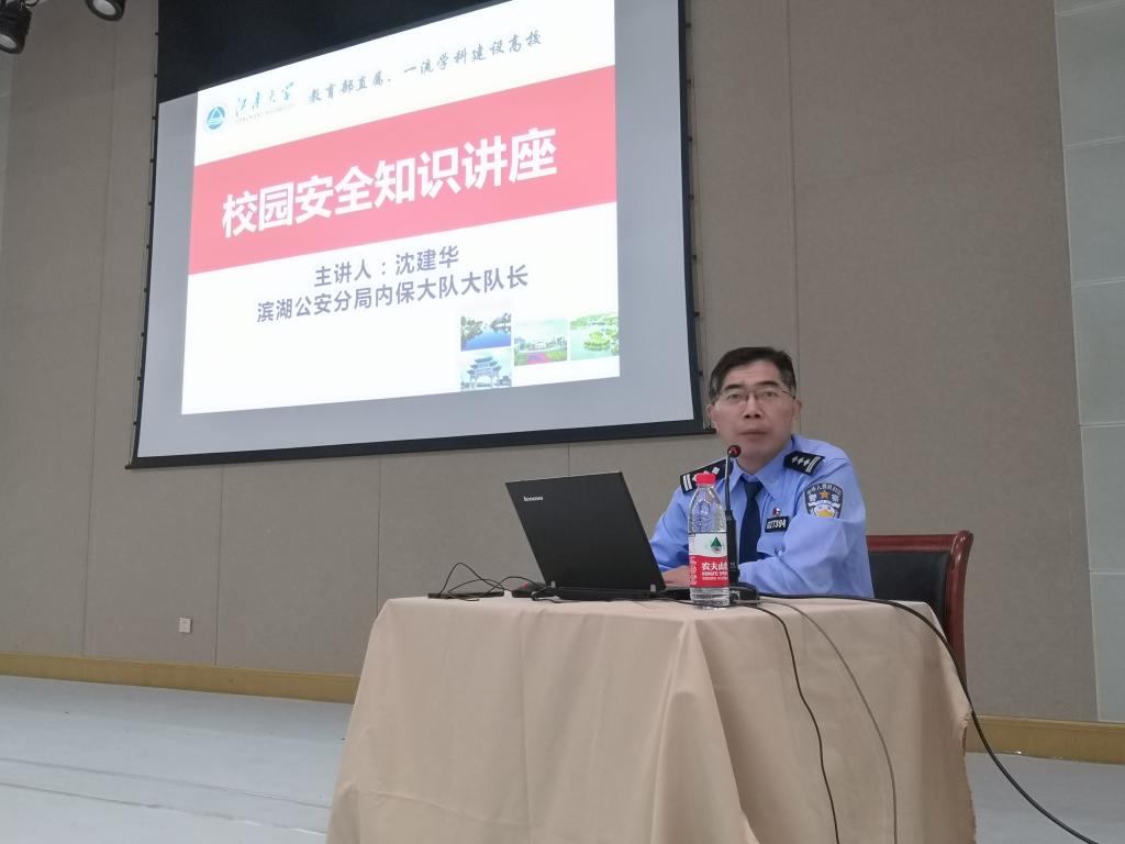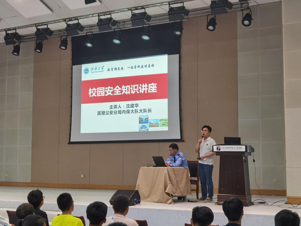 为切实做好新生入学转型教育工作,提高2020级本科生安全意识。近日,ATM娱乐 在学院C区活动中心举办2020级本科生安全知识讲座,本次讲座邀请无锡市滨湖区公安分局内保大队大队长沈建华警官主讲,讲座由学院2020级新生辅导员陈裕主持。
