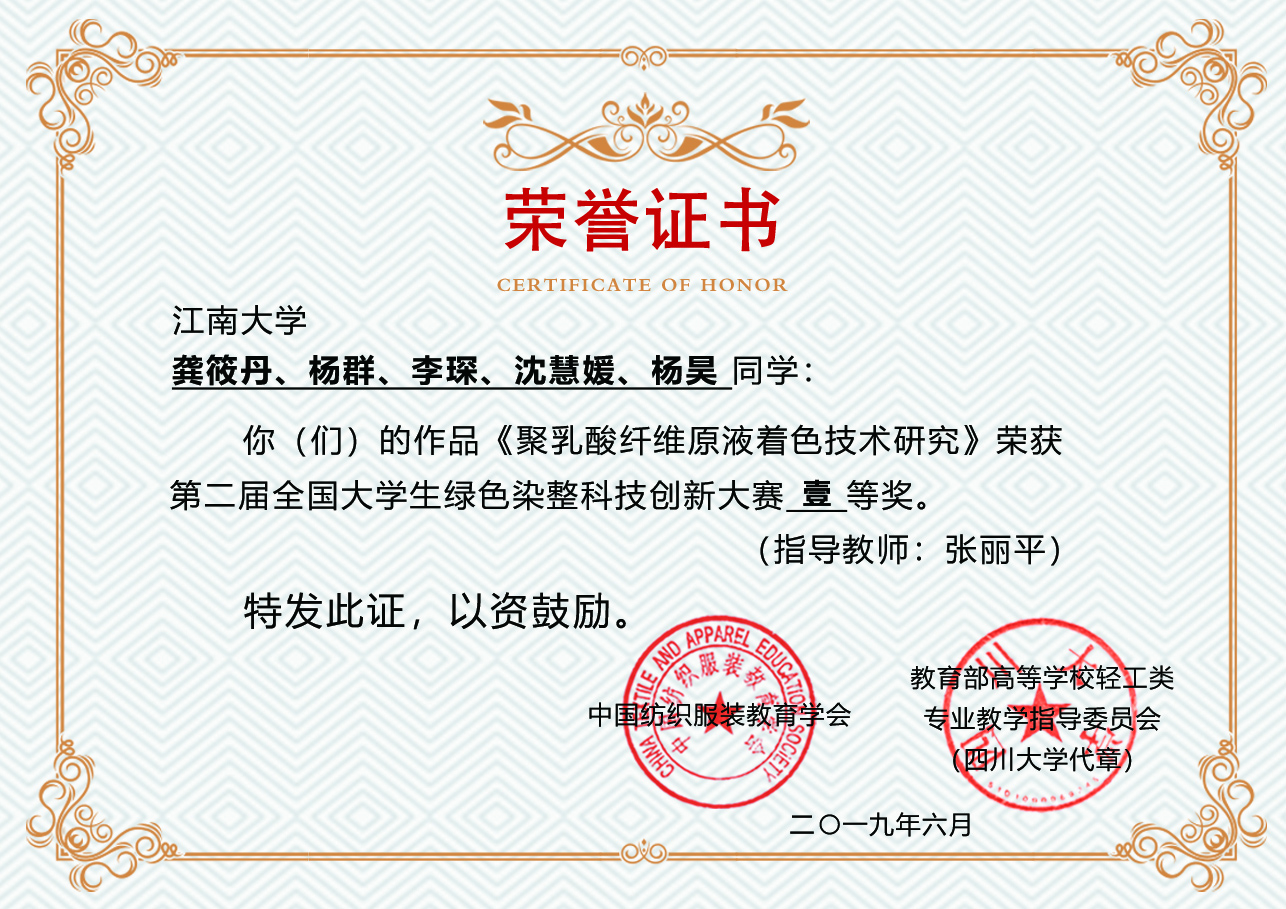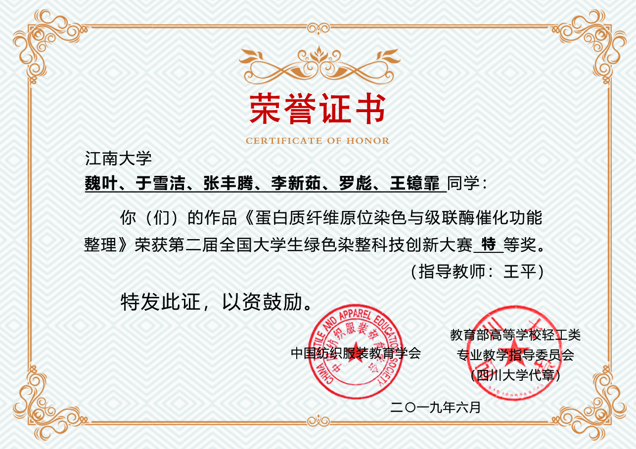 江南大学纺织服装学院共5项作品参评,由王平老师指导的项目《蛋白质纤维原位染色与级联酶催化功能整理》(学生负责人魏叶)荣获特等奖;由张丽平老师指导的项目《聚乳酸纤维原液着色技术研究》(学生负责人龚筱丹)和由王树根老师指导的项目《芳纶染色载体的回收》(学生负责人田科)荣获一等奖;由任学宏、刘颖老师指导的项目《一种抗菌/油水分离纳晶纤维素气凝胶的制备与应用》(学生负责人张艳)荣获二等奖;由袁久刚老师指导的项目《基于DES体系的羊毛低温染色及防缩加工技术》(学生负责人张依依)荣获三等奖。