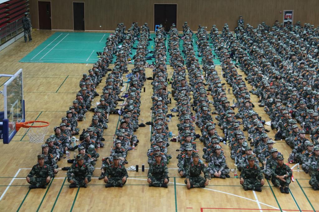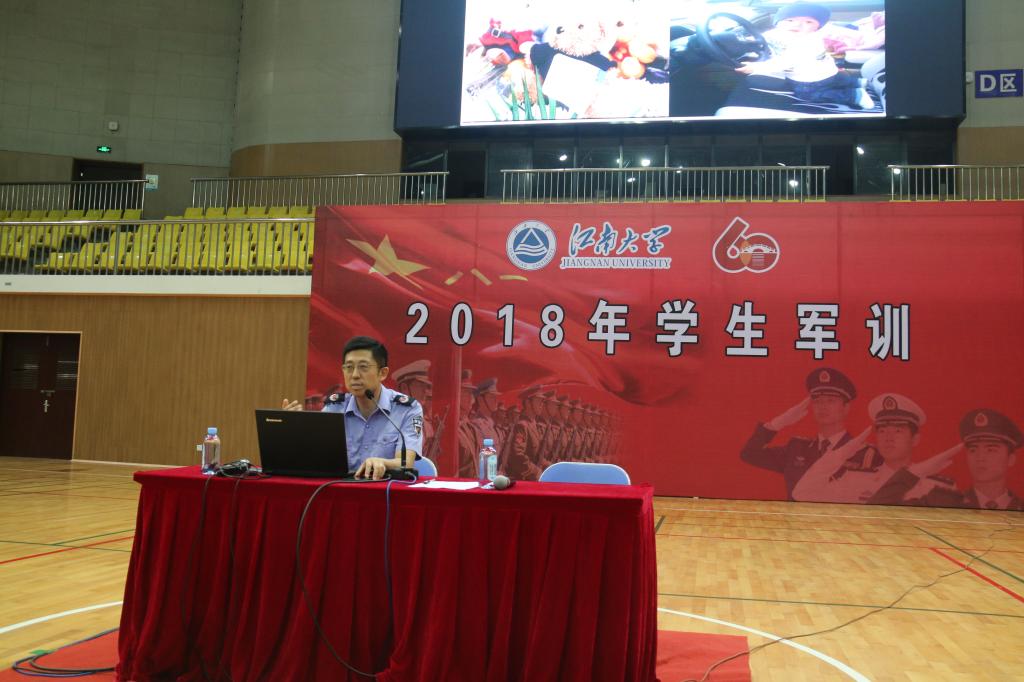 空山新雨后,天气晚来秋。8月21日中午,军训期间的第一次大雨后,全校参训人员及教官齐聚体育馆,聆听消防与救灾讲座。本次讲座由消防支队的消防防火教员朱向东主讲。纺服学院学子坐姿端正并认真听讲。