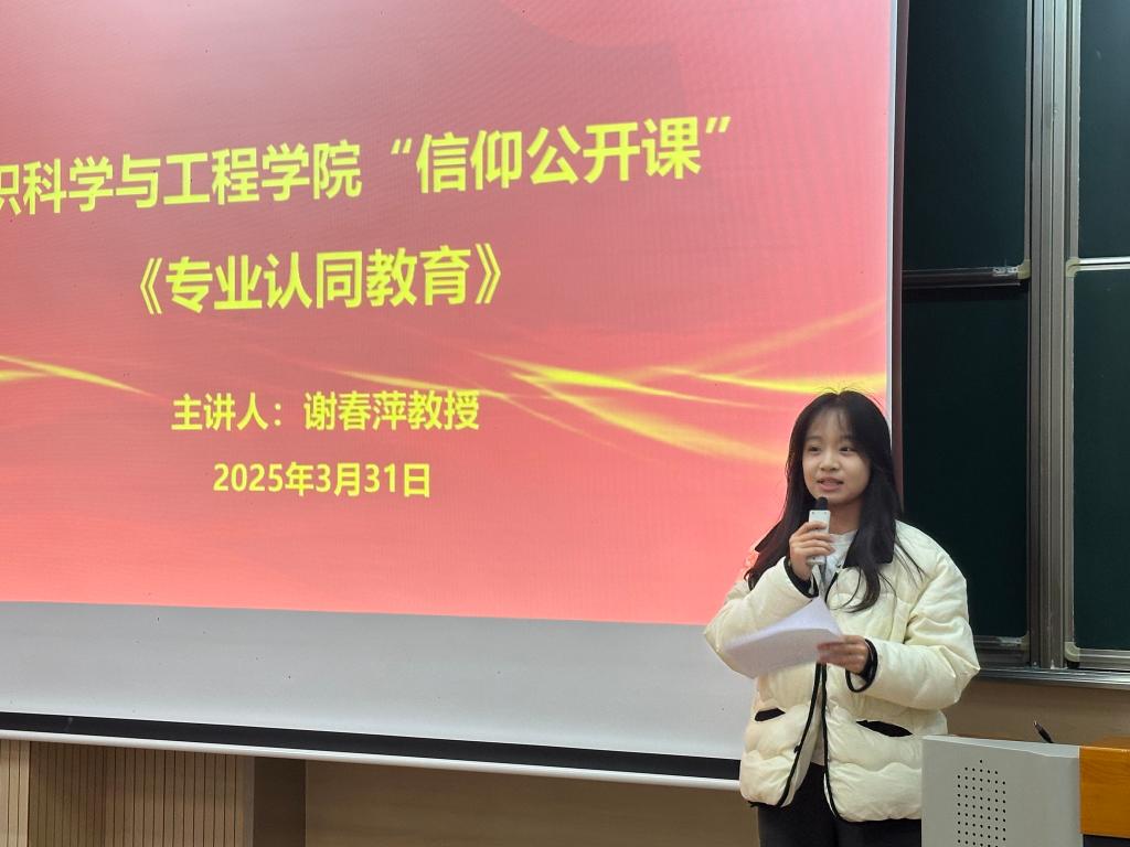 3月31日晚,ATM娱乐 在第一教学楼1B103举办“专业认同教育”信仰公开课。江南大学特邀报告员、学院关工委委员谢春萍教授担任主讲嘉宾,学院辅导员孙慧及2024级全体本科生参与本次活动。活动由团委通讯社李佳雯主持。