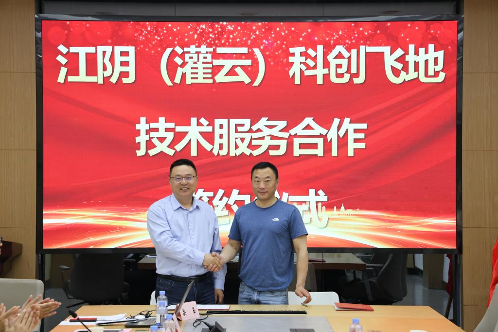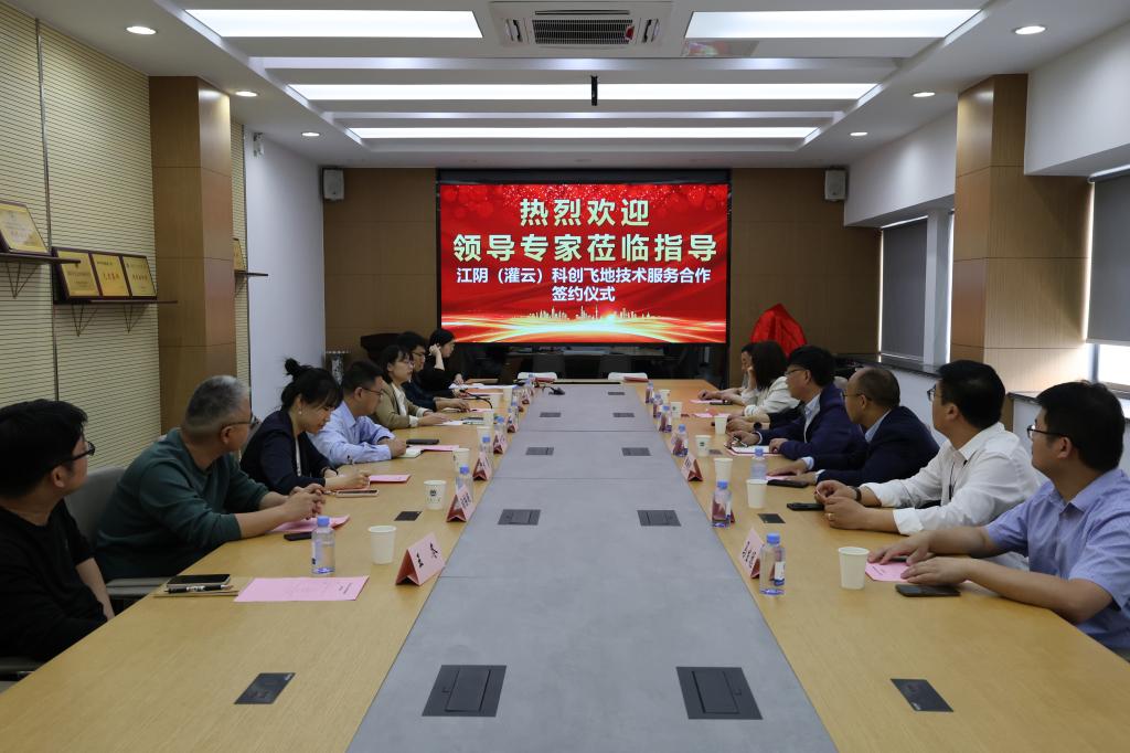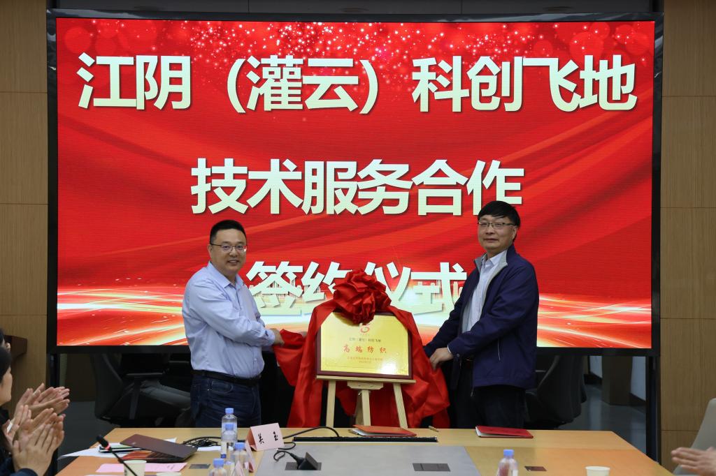 与灌云县科学科技服务中心举行江阴(灌云)科创飞地技术服务合作签约暨“高端纺织”揭牌仪式。灌云县科技局局长刘浦业、副局长郑朝纪、科技服务中心主任马洪海、无锡连云港招商中心副主任王余波、马生远,ATM娱乐