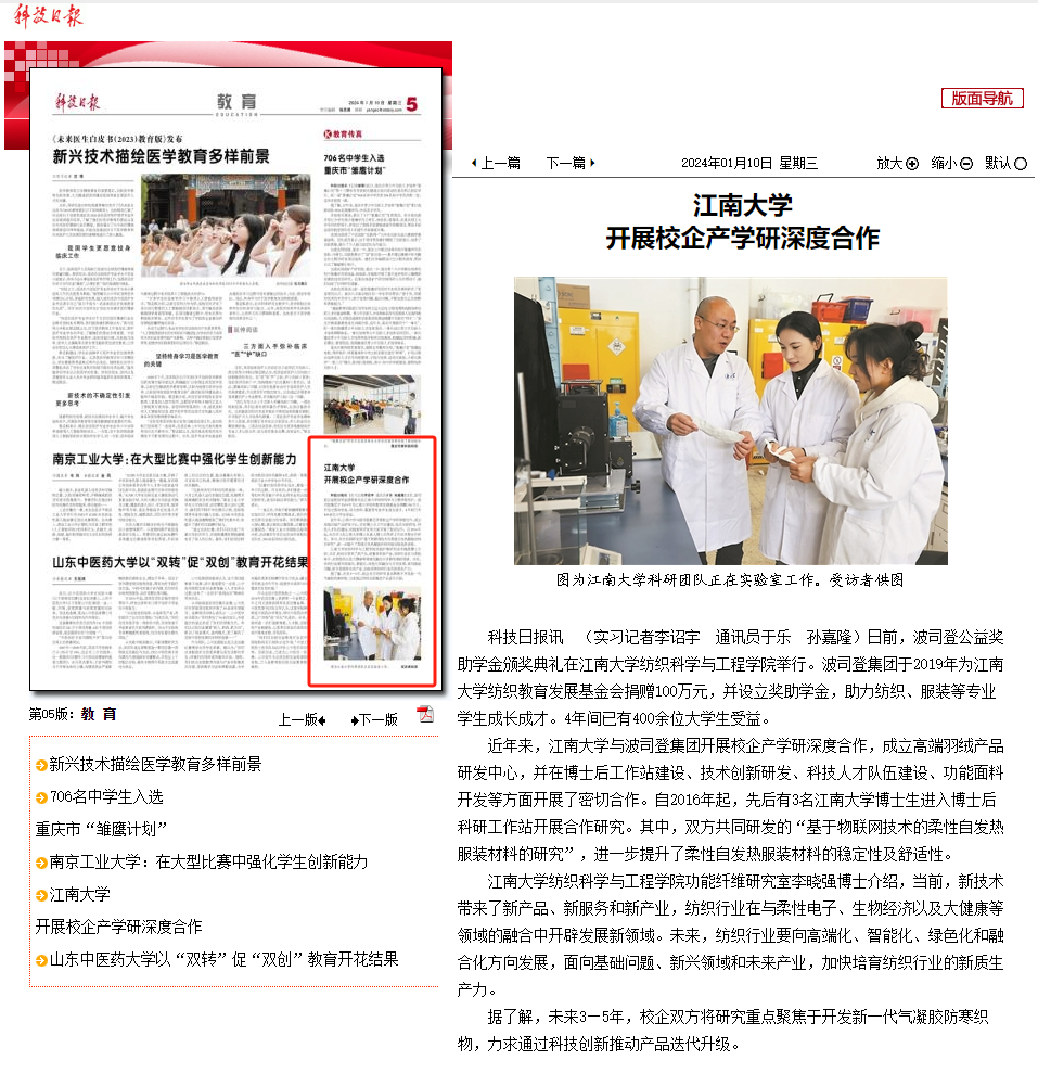 近年来,江南大学与波司登集团开展校企产学研深度合作,成立高端羽绒产品研发中心,并在博士后工作站建设、技术创新研发、科技人才队伍建设、功能面料开发等方面开展了密切合作。自2016年起,先后有3名江南大学博士生进入博士后科研工作站开展合作研究。其中,双方共同研发的“基于物联网技术的柔性自发热服装材料的研究”,进一步提升了柔性自发热服装材料的稳定性及舒适性。