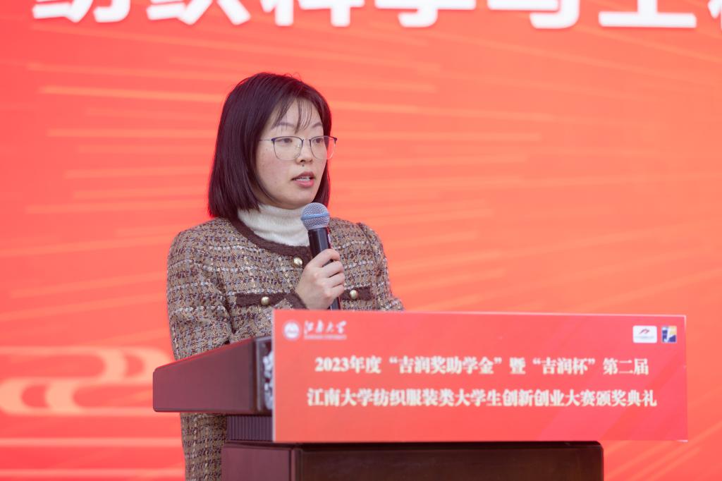 12月27日,2023年度“吉润奖助学金”暨“吉润杯”第二届江南大学纺织服装类大学生创新创业大赛颁奖典礼在大学生北区活动中心F105顺利举行。无锡市吉润国际贸易有限公司副总经理黄正龙及人力资源总监陶东秀等代表,江南大学就业指导中心主任兼学生工作处副处长单筱婷,设计学院党委副书记、副院长江琳娜,ATM娱乐