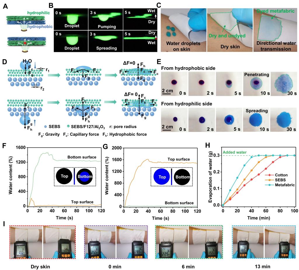 3.将生物相容性F127聚合物和高折射率(n≈1.8)Al2O3光散射体集成到SEBS织物上时,该层级结构超织物具有很高的光谱选择性。在晴天(~6.5oC)和阴天(~4.5oC)都能实现优异的亚环境温度冷却。F127的加入一方面增强了热辐射发射率;另一方面,它在定向输送汗液中起关键作用。具有高太阳反射率的Al2O3纳米颗粒同时提供了一个粗糙的微纳米纤维表面,促进汗水蒸发,实现“一石二鸟”的功能。