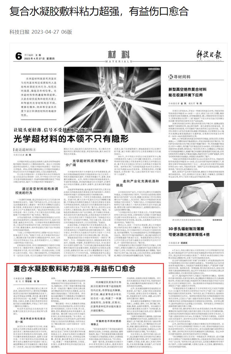 该团队李大伟副研究员介绍,水凝胶是由天然聚合物或合成聚合物交联而成的具有三维网络结构的高分子材料,具有良好的柔韧性和生物相容性,其制作的敷料液体吸收性能好,能够为创面创造一个利于组织再生的湿润环境,能够有效防止瘢痕形成并促进伤口愈合;凝胶滑弹状态可有效避免伤口黏连造成的二次伤害,因此成为医用敷料的极佳选择。