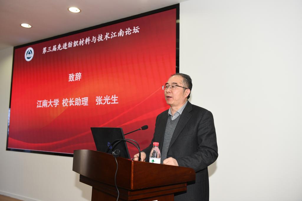江南大学校长助理张光生教授首先致辞。张光生对来自全国各地的杰出学者、与会嘉宾表示热烈欢迎,希望学者们围绕先进纺织材料功能化及高性能化、先进纺织技术交叉融合等方向畅享学术交流盛宴,通过彼此知识的融合、思想的碰撞进一步开拓我校师生的学术视野、激发创新思维;拓宽纺织领域发展思路、促进与领域内同仁的科研合作,推进江南大学学科建设和发展。