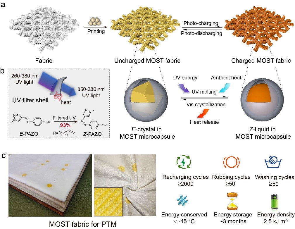 论文设计并合成了吡唑基偶氮苯分子,通过引入含有杂原子的五元环结构能够使吡唑基偶氮苯分子具有更高异构转化率以及异构储能时间。但吡唑基偶氮苯分子的高异构转化率要求单色光刺激响应,标准太阳光谱照射会造成异构不完全。因此,将吡唑基偶氮苯分子包覆进入具有UV滤光性能的微胶囊内,既解决了吡唑基偶氮苯分子相变过程中会产生泄露的问题,同时赋予其在宽光谱紫外光照下具有高异构转化率的性能。通过结合分子光异构与相变能量储存,UV滤光型微胶囊总能量密度达到119 J g-1。通过UV滤光型储能微胶囊制备吡唑基偶氮苯分子储能织物,在可见光光源下,织物表面温度提升达到36.6 ℃,充能后的吡唑基偶氮苯分子储能织物对比未充能状态下达到更高的表面温度,温差达到6 ℃。在2000次能量充放、50次水洗、50次摩擦后吡唑基偶氮苯分子储能织物仍具备高效太阳能储能密度。