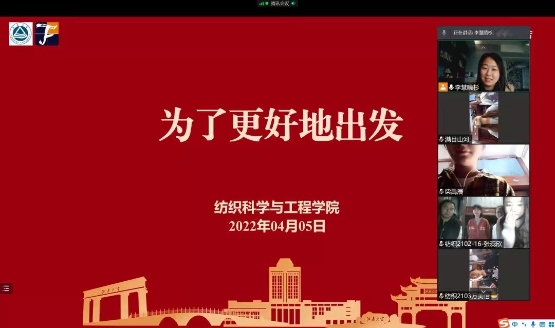 “大家都在线了吗?都能听到吗?” 隔离不隔心,关爱一直在线。近日为贯彻学校疫情防控工作的部署和要求,关心和指导在校学生有序开展学习和生活,学院34位本科生班主任,在校园封闭式管理的关键时期,通过云班会与班级学生畅谈规划、化解焦虑、共话成长,做到主动出击、有问必答,助力守护平安江南,助益纺织学子向阳前行。