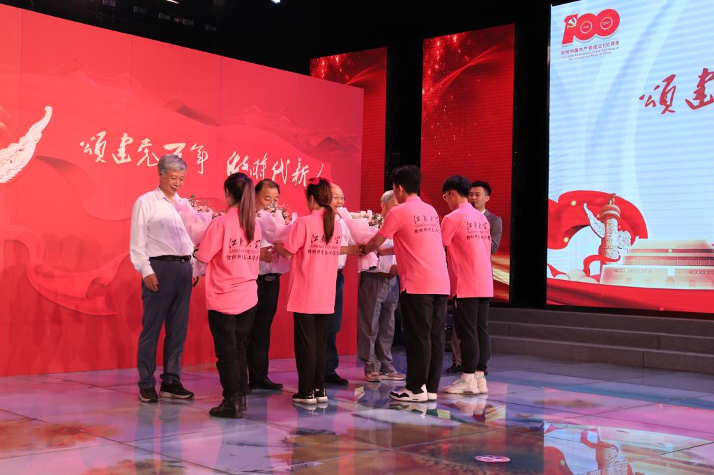 一百年雄关漫道、九万里风鹏正举。赓续精神血脉,筑牢理想信念,传承红色基因,争做时代新人。本次访谈由四位无锡市关工委报告团成员担任主讲嘉宾,他们分别是:原无锡庆丰集团漂染公司纪委书记蒋川海,原总参56研究所政委兼党委书记张发海,原无锡市侨谊实验中学书记、校长钱昭平,原江南大学党委副书记、纪委书记娄国栋。4位嘉宾以建国后的四个时期划分来讲述党史故事:新民主主义革命时期,开天辟地,完成救国大业;社会主义革命和建设时期,改天换地,完成兴国大业;改革开放和社会主义现代化建设新时期,翻天覆地,推进富国大业;中国特色社会主义新时代,惊天动地,实现强国大业。老同志们以恳切热烈的语调娓娓道来新中国艰辛而辉煌的发展之路,他们丰富的人生阅历和至高的思想觉悟正是值得青年学子学习的最佳榜样。伴随着明亮的灯光、激昂的配乐、缤纷的影像等多重舞台效果,教育活动灵活生动。四位主讲嘉宾为每个篇章分别推荐了主题曲目:《没有共产党就没有新中国》、《我们走在大路上》、《春天的故事》、《少年》,正是党带领人民克服万难走在改革开放的道路上,中华大地才开启春天故事的序章,万千少年人才能在如今的幸福生活里自由成长。