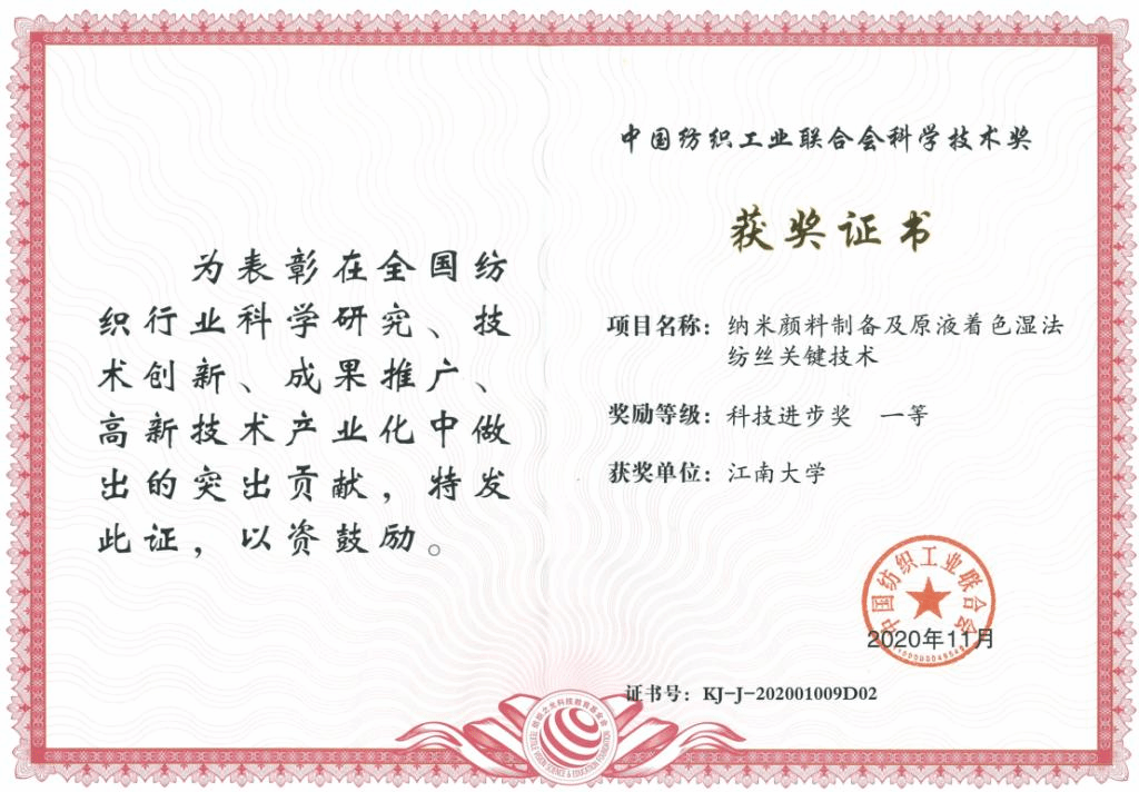 付少海教授团队的“纳米颜料制备及原液着色湿法纺丝关键技术” 项目荣获科技进步一等奖 (第二单位)