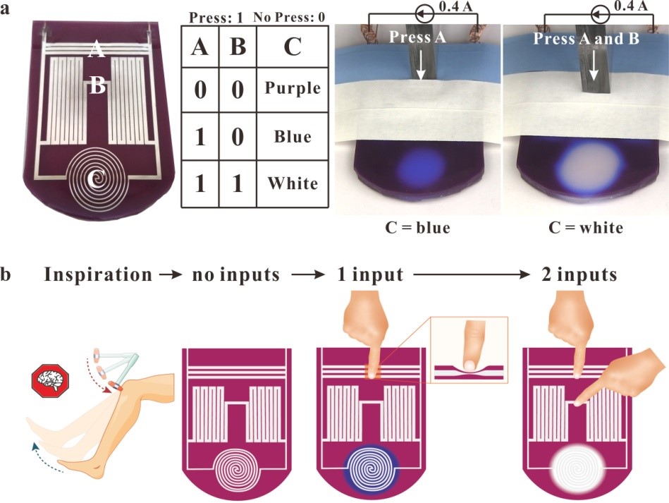 纺织服装学院葛明桥教授团队发现逻辑决策可以在材料层面完成,而不依赖半导体运算。受到章鱼手臂中分布式神经网络的启发,团队展示了一个完全柔软,可拉伸的有机硅复合材料(图1)。该有机硅复合体掺杂有热致变色颜料并可以受液态金属的支配,液态金属的变形能力使焦耳热发生几何变化加热,从而实现可调的热机械着色及感知触觉和应变(图2)。在更复杂的电路中,变形的液态金属可以重新分配电能到远端部分,以一种触觉“输入”转换成数字比色“输出”的方式来实现逻辑运算(图3)。