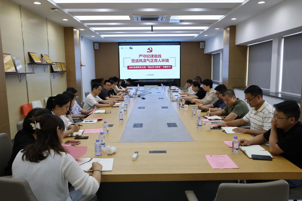 纺织系教师党支部在学院A306会议室召开“党纪学习教育”专题学习。校党委委员、党委办公室主任、保密工作办公室主任王维到场巡听督学,校党委委员、学院党委书记张菁燕,及党支部20余名党员同志参加学习。专题学习会议由党支部书记俞科静教授主持。