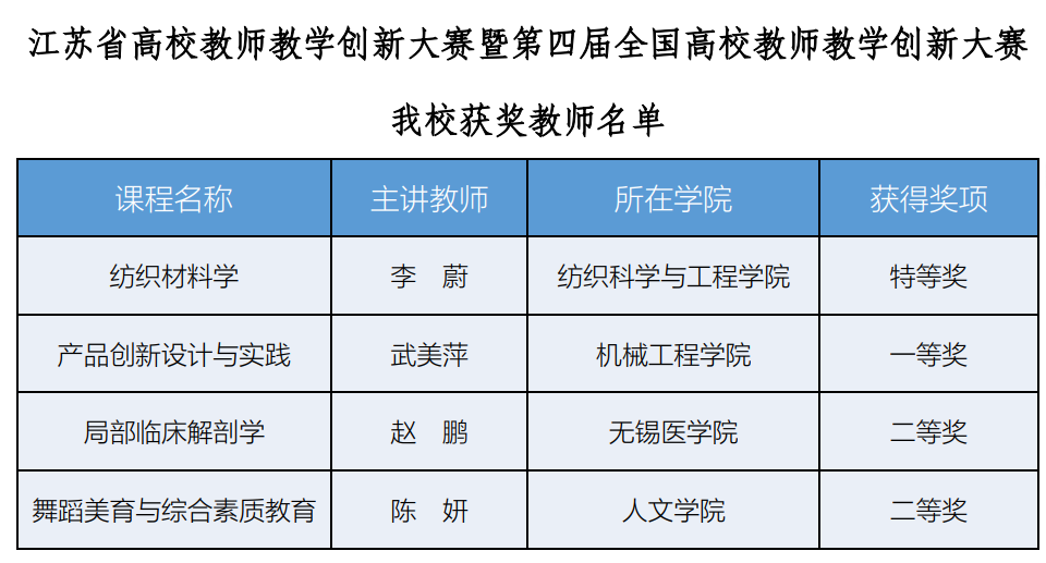 近日,第四届江苏省高校教师教学创新大赛获奖名单公布,江南大学共有4位教师获奖。ATM娱乐