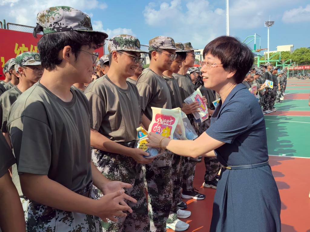 党委书记张菁燕,院长付少海,党委副书记、副院长杨莉勤,学工办主任兼分团委书记任学敏。带训辅导员和班主任代表来到军训场地慰问带训教官和参训学生。
