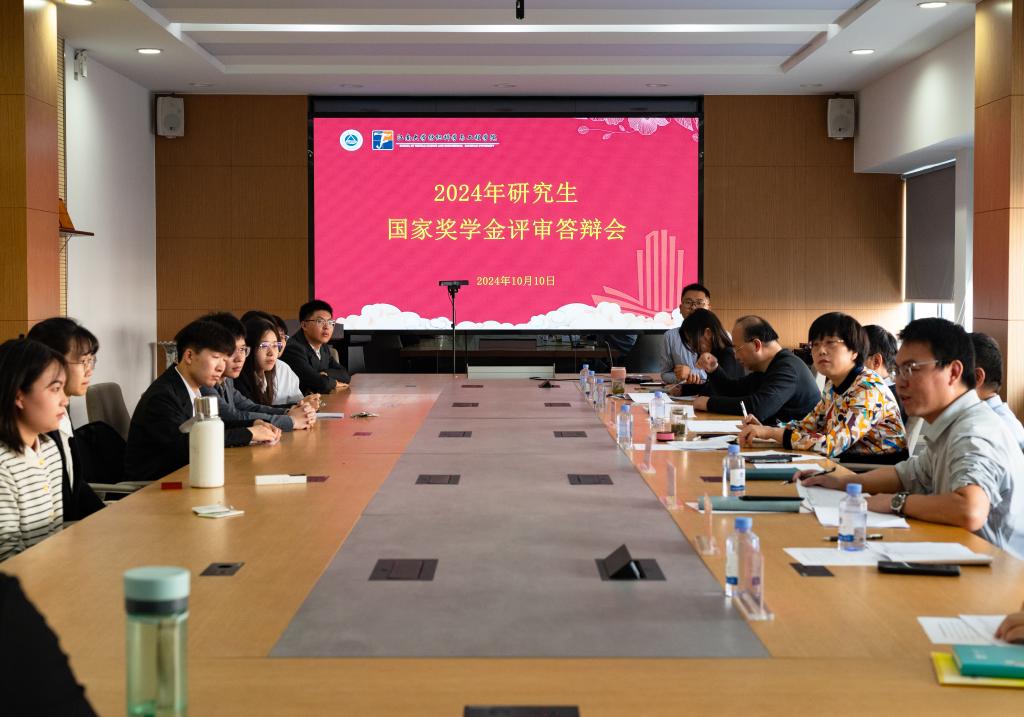 于A306会议室召开2024年研究生国家奖学金答辩会,学院党委书记张菁燕,院长付少海,党委副书记兼副院长杨莉勤,副院长马丕波,以及导师代表蒋高明、王强、殷允杰,学工办主任兼分团委书记任学敏出席本次答辩会并担任评委,2023级、2024级研究生辅导员伍胤鸿主持答辩会。
