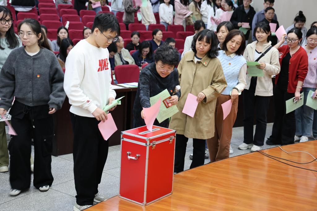 接着,大会依次通过“党员大会选举办法(草案)”、大会监票人、计票人名单。大会选举环节,经正式党员对15名候选人进行无记名投票、差额选举的方式,顺利产生出席校第五次党代会的12名代表。