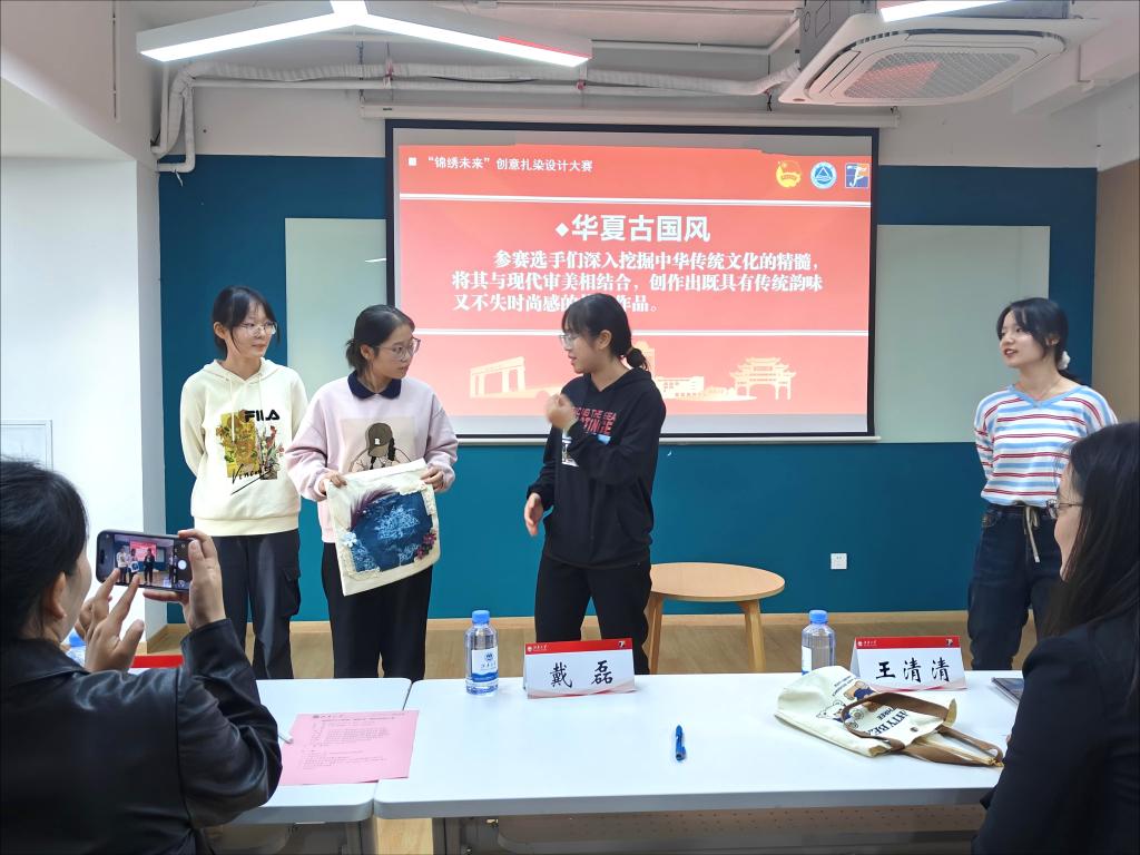 “锦绣未来”创意扎染设计大赛决赛在梅园“一站式”学生社区成功举办。学院轻化工程系教师戴磊、苏静,纺织工程系教师王清清、陈超余,学院学工办主任兼分团委书记任学敏等出席大赛并担任评委。学生参赛团队、学生观众及学生会成员参加活动。