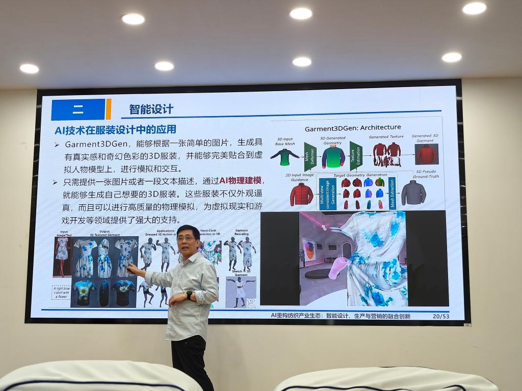 蒋高明教授以自己的科研经历和科研成果为案例,重点梳理了纺织AI的发展情况。首先从智能设计出发,介绍了其自主研发的具有花型设计、工艺管理、织物仿真和虚拟展示、工艺检索功能的纺织AI设计系统iTDS3.0,举实例讲解了AI在纺织产品设计的应用;并介绍了AI技术在服装流行趋势预测中、在纺织图案中、在纺织产品检索中以及在防刺材料性能预测中的应用。接着蒋高明教授对智能生产进行介绍,从数字孪生工厂架构到能耗优化模型再到柔性生产排程,总结了智能生产的优势:效率提升,质量优化和成本降低;并介绍了一些AI在实际生产中的应用及其案例。然后蒋高明教授通过消费者画像系统,动态定价模型,库存—销售联动和社交营销机器人介绍了智能营销并展示了智能营销的效果总览,随后介绍了一些AI技术应用实例。蒋高明教授通过理论与实践相结合的方式,生动地为我们介绍了智能设计,生产与营销的融合创新;AI技术作为纺织行业数字化转型和智能化升级的核心力量,已经展现出巨大的潜力和价值。未来随着技术的不断进步和应用场景的拓展,纺织AI技术将在纺织行业的各个环节发挥更加重要的作用。