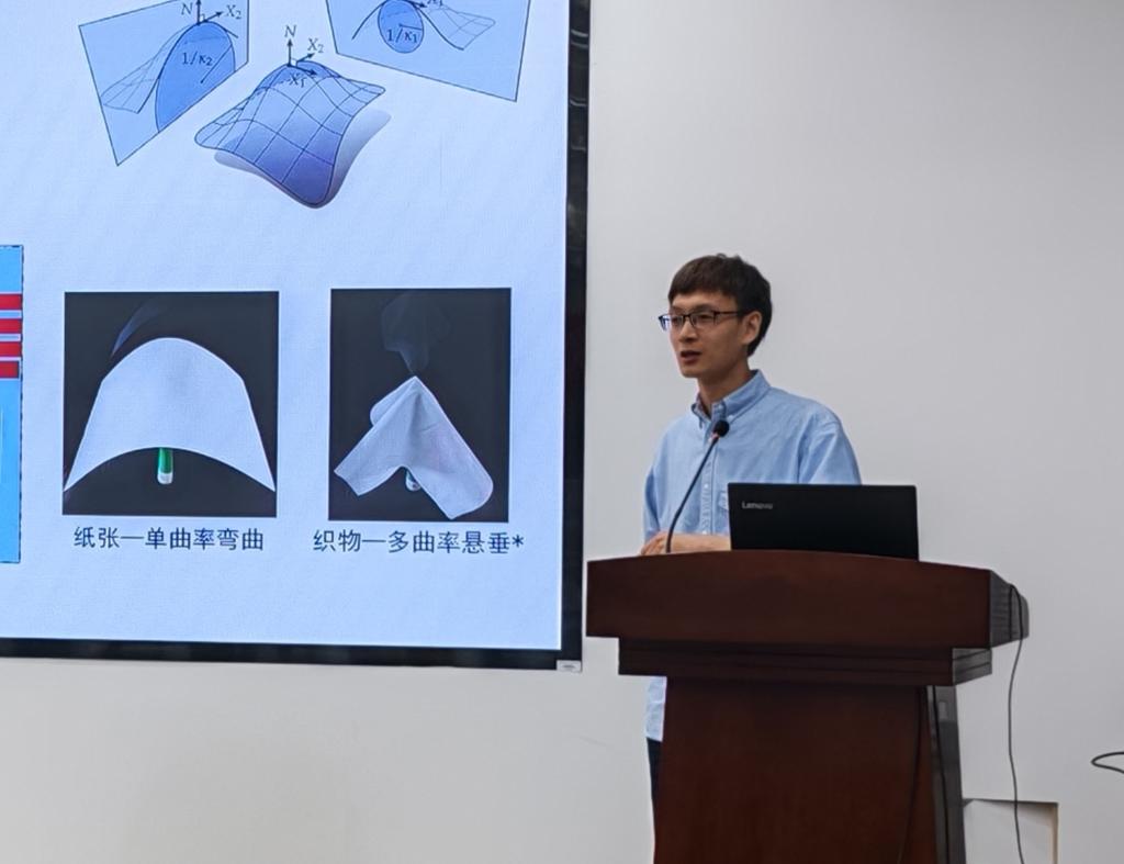 孙丰鑫以同学们感兴趣的机器人话题为切入点,带领大家探索纺织材料在软体机器人领域的创新应用。当大家还在谈论传统金属机器人时,由织物层和硅胶层组成的柔性机器人,能像生物肌肉一样柔软弯曲,具备柔和、安全、舒适的特点,还拥有高效、可控的双侧弯曲变形能力和自感知功能。他提出以细观几何与多尺度结构为基础的纺织材料仍有许多特性值得探讨,激发了同学们的科研兴趣和创新思维。