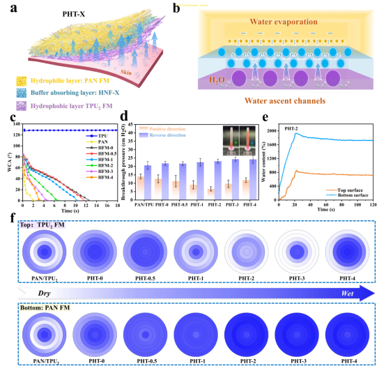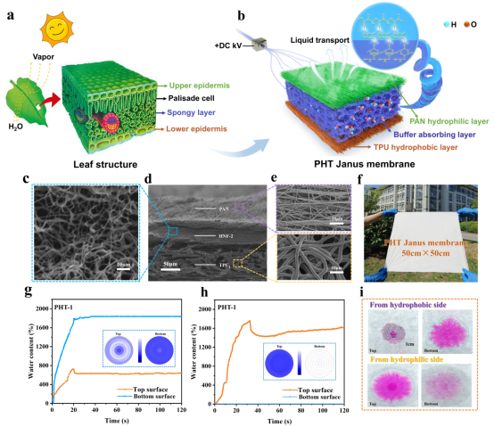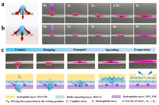 针织中心研究团队受植物蒸腾作用中叶片多级孔隙结构与液体输运机制的启发,创新设计出一种集成“纵向传输通道+海绵状连通孔洞”的Janus纳米纤维膜。通过引入三维螺旋纳米纤维膜作为中间功能层,成功构建了类叶片海绵组织结构。该结构能够将皮肤表面的汗液迅速抽离并定向传输且存储,从而确保皮肤接触面的持久干爽。随后,存储水分由蒸发界面驱动,通过上表层纵向通道逐步排出,实现了“高效导湿”与“自主蒸发”两个过程的解耦与分步进行,有效突破了传统面料因表面蒸发性能不足而制约液体传输效率的技术难题。同时,利用多巴胺介导界面调控策略,协同优化膜层的孔隙结构与润湿性能,实现了纤维膜液体定向传输行为可控定制。该Janus纤维膜表现出卓越的综合性能:单向传输指数(MMT)高达1250%,油水分离效率达到98.92%,并具备13860.77 L·m⁻²·h⁻¹的高通量分离能力。此外,该膜可与传统机织或针织面料复合,在保持织物原有柔软性与穿着舒适度的基础上,显著提升其湿度管理能力(透湿量增加59%)与热管理性能(降温达3.3℃),为穿着者营造持久干爽的微气候环境。