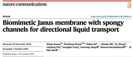 /针织技术教育部工程研究中心蒋高明教授团队在综合性国际期刊《Nature Communications》上发表题为“Biomimetic Janus Membrane with Spongy Channels for Directional Liquid Transport”的期刊论文。实现了ATM娱乐(中国)官方网站