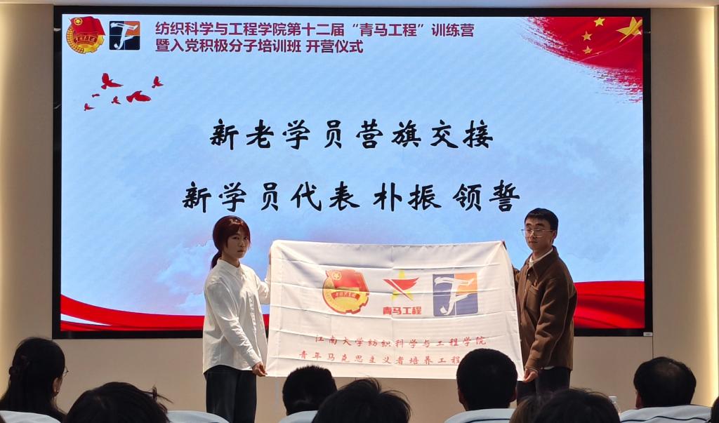 往届优秀学员孙静怡分享心得。她以自身经验和感悟现身说法,鼓励新一届青马学员们带着热情和坚持继续奔跑,为实现中华民族伟大复兴的中国梦注入纺织力量。 随后,孙静怡为第十二届“青年马克思主义者”培养工程训练营学员授旗,学员代表朴振带领全体学员宣读誓词。